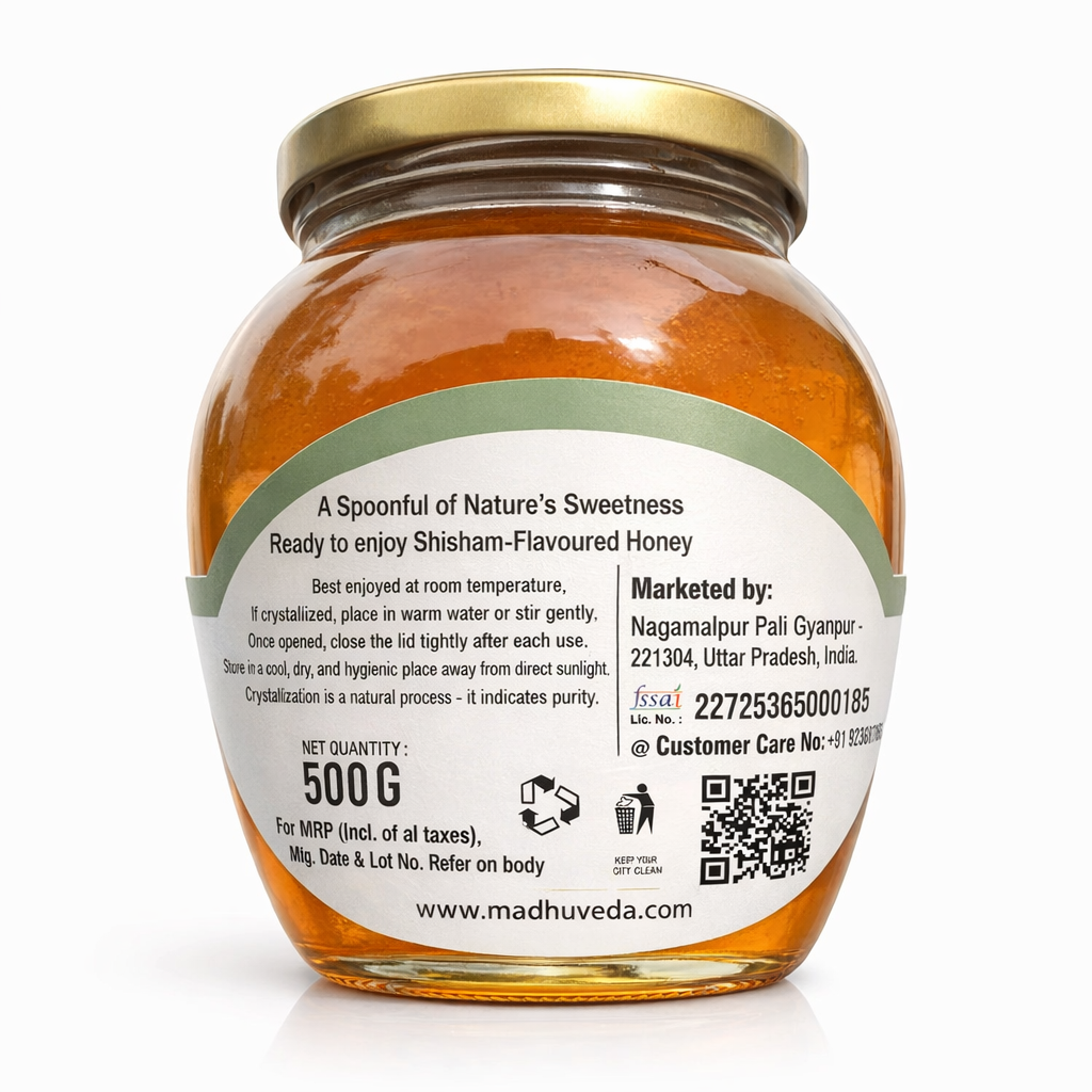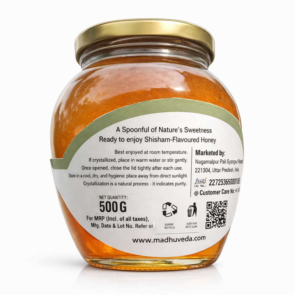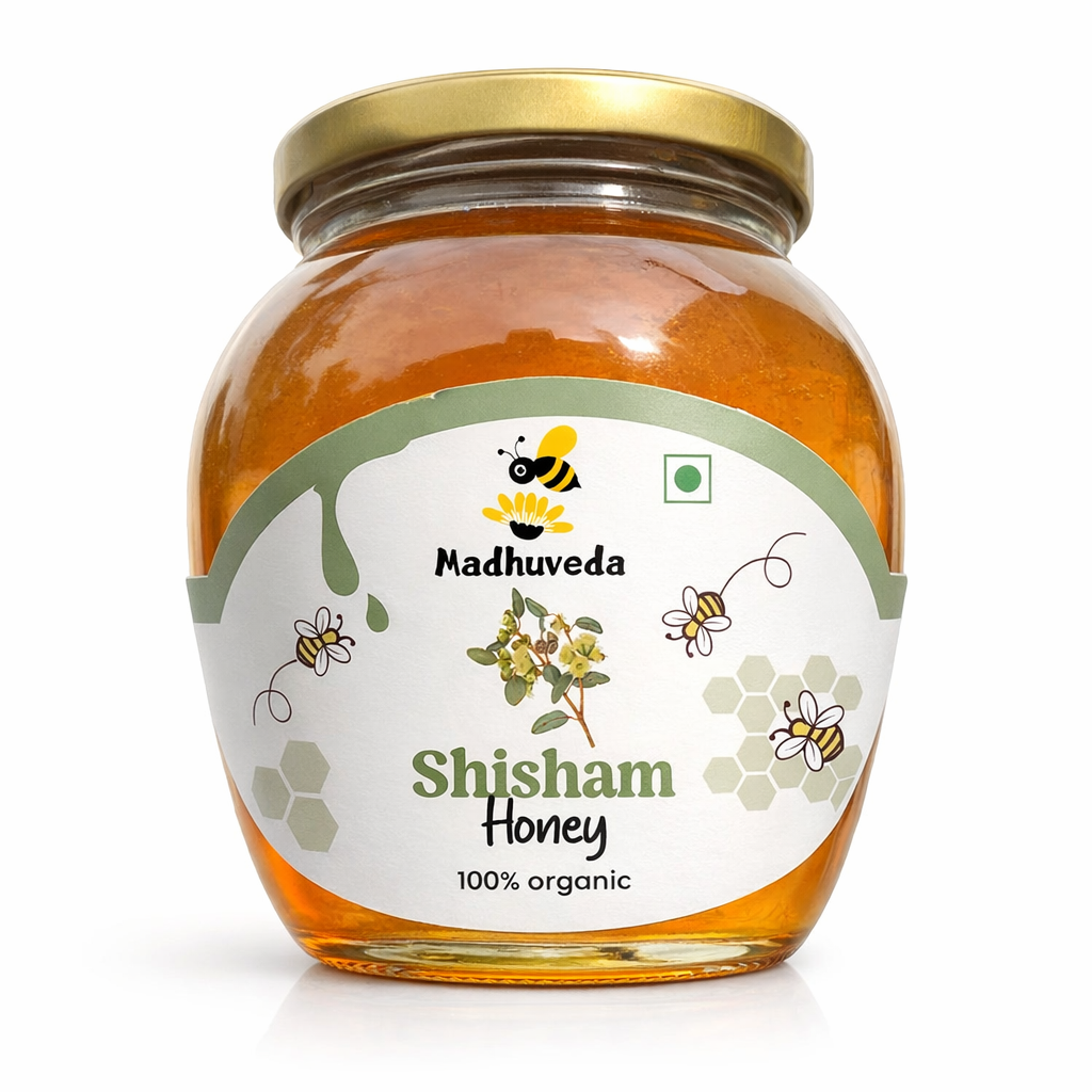 MadhuVeda’s Shisham Honey is 100% pure, sealed & organic—collected from organic Shisham flower nectar. Extracted only after bees naturally seal the hives with wax layer. No heating, no harm to bees. 100% money-back if proven adulterated or impure.